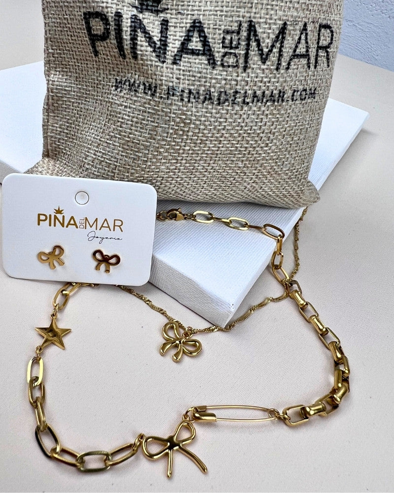 Eleva cada momento a una aventura inolvidable con el Set Collar y Aretes Bali, una elegante y exclusiva pieza de acero de alta calidad con un baño en micras de Oro. Añade un toque de sofisticación a tu atuendo y no te pierdas esta oportunidad única para vivir experiencias radiantes. ¡Hazte con el tuyo ahora mismo y comienza esta emocionante travesía!